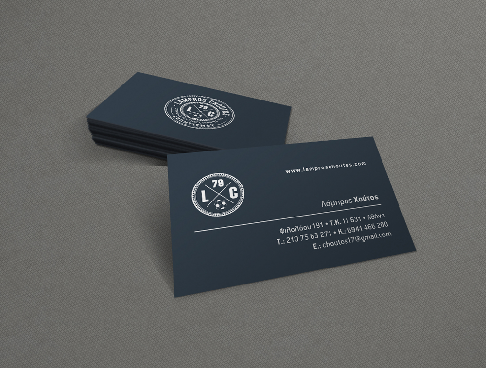 Concept: Δημιουργήσαμε μια «σφραγίδα», στην οποία το όνομα της εταιρίας και το αντικείμενο δραστηριότητάς της κυριαρχούν. Χρησιμοποιώντας τα αρχικά του ονόματος του -Λάμπρου Χούτου- τον αριθμό της φανέλας του και τη μπάλα ποδοσφαίρου παραπέμπουμε με επιτυχία στην ιδιότητα με την οποία έγινε διάσημος ο Λάμπρος Χούτος, αυτή του ποδοσφαιριστή, αλλά επιτυγχάνεται και η σύνδεση με τη παρούσα ιδιότητα που αποτελεί συνέχεια της πορείας του.