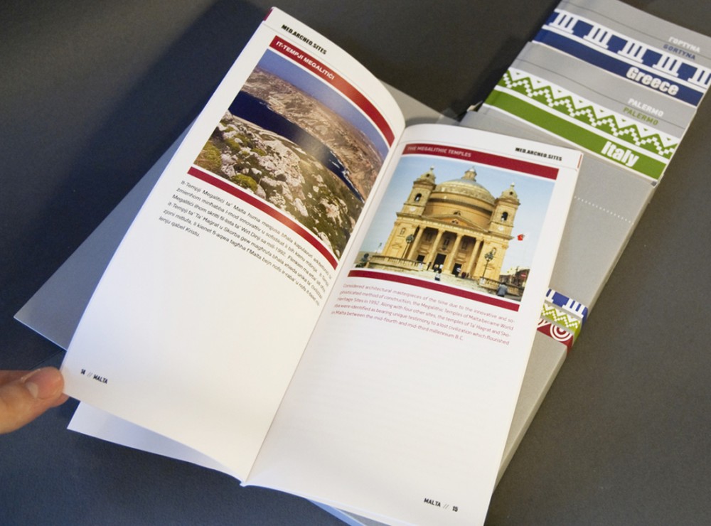 Brief: Το Med.Archeo.Sites interreg III B ARCHIM ED είναι ευρωπαϊκό πρόγραμμα μελέτης και αξιοποίησης Αρχαιολογικών Χώρων της περιοχής της Μεσογείου. Στο πλαίσιο του προγράμματος δημιουργήθηκε ένα δίκτυο ανταλλαγής τεχνογνωσίας και διάχυσης πληροφορίας που αφορούν σε συγκεκριμένους αρχαιολογικούς χώρους των πόλεων – εταίρων της Μεσογείου. Μέσω μίας ενιαίας διαδικτυακής πλατφόρμας, με τη χρήση Γεωπληροφορικών Συστημάτων (GIS), προβάλλεται η πολιτιστική κληρονομιά των συμμετεχόντων χωρών (Ελλάδας, Ιταλίας, Μάλτας). Η Ελλάδα εκπροσωπήθηκε από την ΑΕΔΑ, το Δήμο Γόρτυνας και την 6η Εφορεία Προϊστορικών και Κλασικών Αρχαιοτήτων Πατρών του ΥΠ.ΠΟ. Στις δράσεις ευαισθητοποίησης και προβολής συνολικά για το πρόγραμμα περιλαμβάνονταν: η προβολή των αρχαιολογικών χώρων του προγράμματος σε τουριστικό επίπεδο με δημιουργία και έκδοση τουριστικών-πολιτιστικών οδηγών, η δημιουργία πολυμέσων (DVD), καθώς και η δημιουργία ενός ενιαίου δικτυακού αρχαιολογικού πάρκου για το κοινό. Μας ζητήθηκε να σχεδιάσουμε τις ειδικές αυτές εκδόσεις οι οποίες αποτελούνταν από 6 τουριστικούς-πολιτιστικούς οδηγούς, DVD και ειδική θήκη.