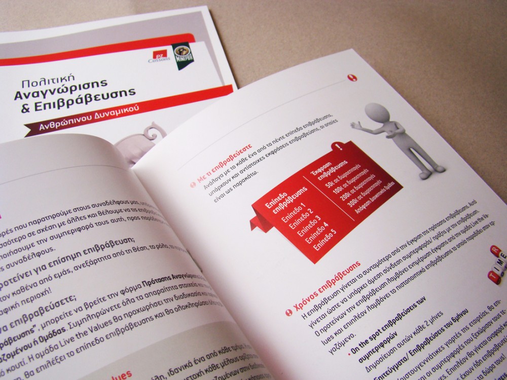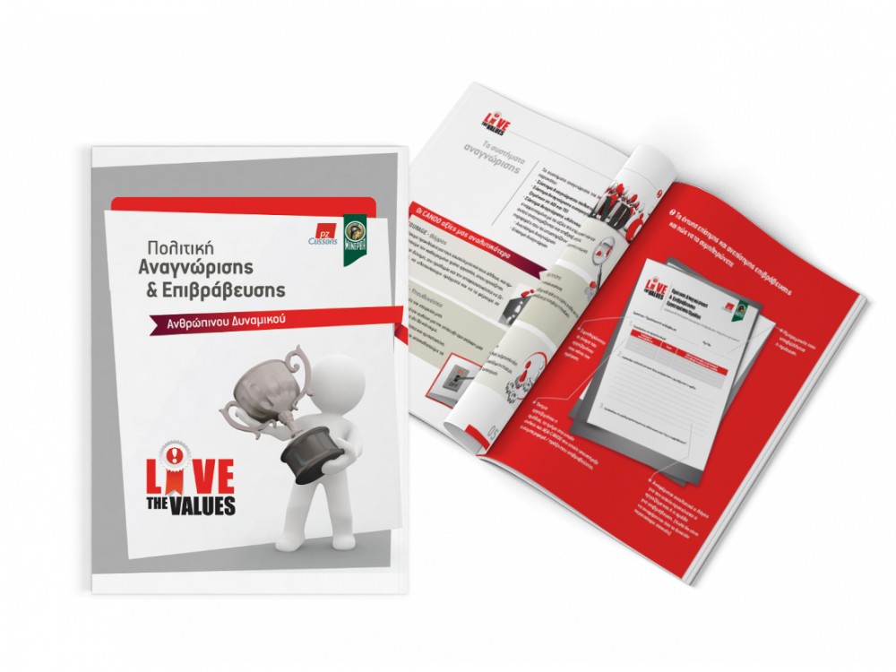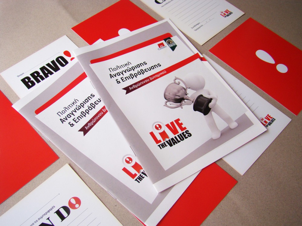 Brief: Οι πολιτικές τις οποίες ακολουθεί η εταιρία στο κομμάτι του ανθρώπινου δυναμικού στοχεύουν στο να αναγνωριστούν, να επιβραβευθούν και να γνωστοποιηθούν σε όλη την εταιρία συμπεριφορές, πρωτοβουλίες και επιτεύγματα των εργαζομένων, τα οποία προάγουν τις αξίες της εταιρίας, δηλαδή του CAN DO (Courage, Accountability, Networking, Drive, Oneness). Τα οφέλη αυτών των πολιτικών είναι εξίσου σημαντικά για τους εργαζόμενους αλλά και την εταιρία. Αναλάβαμε να σχεδιάσουμε το concept και το λογότυπο του προγράμματος επιβράβευσης «Live the Values». Βάσει του concept που δημιουργήσαμε σχεδιάστηκαν όλες οι έντυπες εφαρμογές.