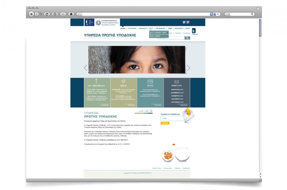 Concept: Βασικός μας στόχος στο σχεδιασμό, ήταν να δώσουμε με την «δύναμη της εικόνας» τον τομέα δράσης της υπηρεσίας. Επιλέξαμε φωτογραφίες ανθρώπων να εναλλάσσονται στο κεντρικό banner της ιστοσελίδας με κοντινό πλάνο στα μάτια, το  "Παράθυρο της ψυχής». Σχεδιάσαμε μια ιστοσελίδα με φιλικό περιβάλλον για το χρήστη, με εύκολη πλοήγηση, με χρώματα που παραπέμπουν σε δημόσιο φορέα, αλλά και στοιχεία που προκαλούν θετικά συναισθήματα.