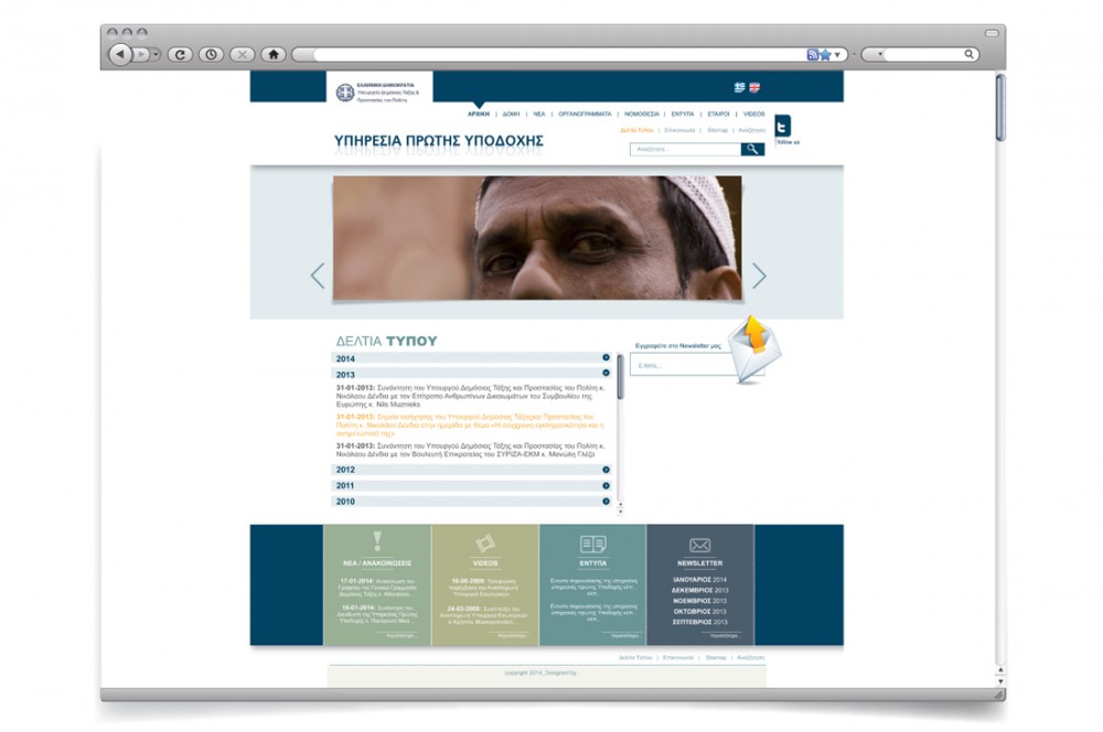 Brief: Αποστολή της Υπηρεσίας Πρώτης Υποδοχής είναι η αποτελεσματική διαχείριση των υπηκόων τρίτων χωρών που εισέρχονται παρανόμως στην χώρα, σε συνθήκες σεβασμού της αξιοπρέπειάς τους, με την υπαγωγή τους σε διαδικασίες πρώτης υποδοχής. Η Υπηρεσία Πρώτης Υποδοχής μας ανέθεσε τη δημιουργία μιας ιστοσελίδας της οποίας οι επισκέπτες θα αντιλαμβάνονται με τη πρώτη ματιά, το τομέα δράσης της Υπηρεσίας και το σημαντικό της έργο.