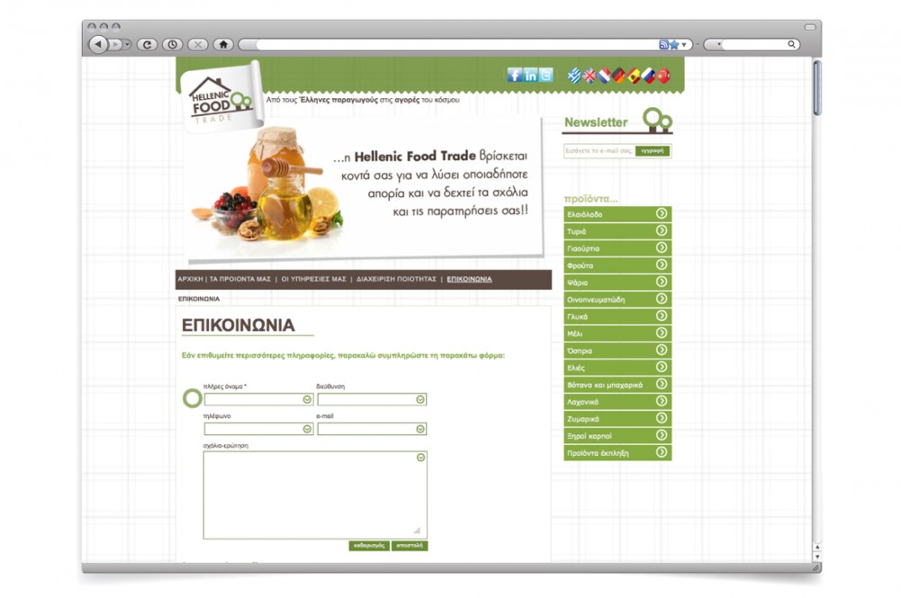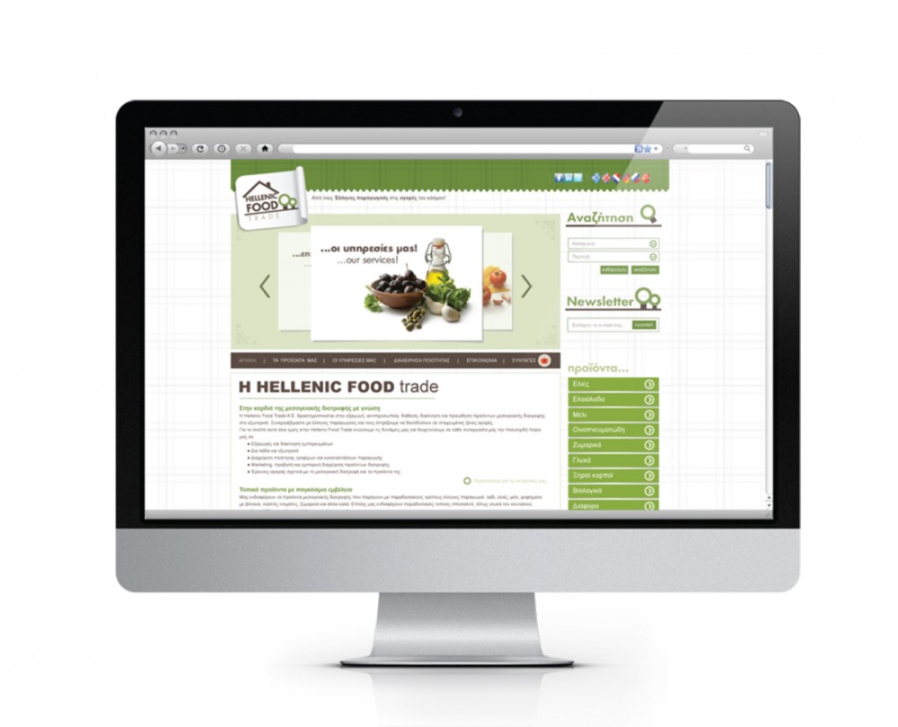 Brief: H Hellenic Food Trade δραστηριοποιείται στην εξαγωγή, αντιπροσωπεία, διάθεση, διακίνηση και προώθηση προϊόντων μεσογειακής διατροφής στο εξωτερικό. Συνεργάζεται με Έλληνες παραγωγούς και τους στηρίζει με σκοπό να διεισδύσουν σε στοχευμένες ξένες αγορές. Mας ζητήθηκε να προτείνουμε το όνομα της εταιρίας, να σχεδιάσουμε την εταιρική της ταυτότητα και την ιστοσελίδα της σε 7 γλώσσες. O στόχος ήταν να δημιουργηθεί μια βάση δεδομένων με χονδρέμπορους, δίκτυα διανομής για είδη διατροφής και μικρότερες εμπορικές επιχειρήσεις με προϊόντα μεσογειακής διατροφής.