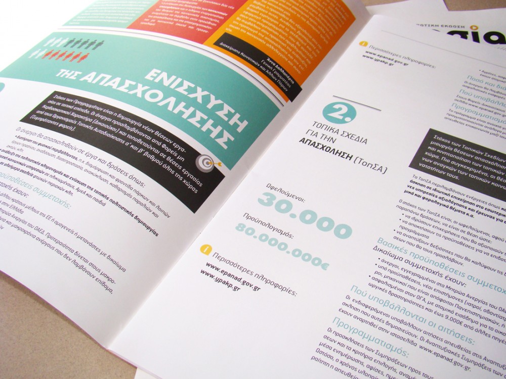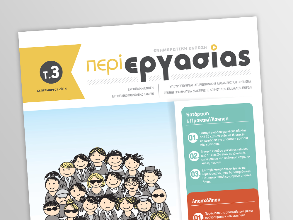 Για την παρουσίαση των συγκεκριμένων προγραμμάτων αποφασίστηκε η δημιουργία ενημερωτικής περιοδικής έκδοσης. Μας ανατέθηκε να προτείνουμε το όνομα, να λογοτυπήσουμε και να σχεδιάσουμε τη συγκεκριμένη έκδοση. Η έκδοση έπρεπε να έχει ανθρωποκεντρικό χαρακτήρα και να παρουσιάζει με σαφή διαχωρισμό τα προγράμματα που απευθύνονται σε διαφορετικές ομάδες ενδιαφερομένων.